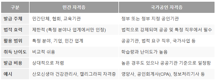 국가공인 자격증은 정규직, 공공기관, 또는 법적 요건을 충족해야 하는 직무에 적합하며, 민간 자격증은 창업, 프리랜서, 또는 개인 역량 강화에 적합합니다.