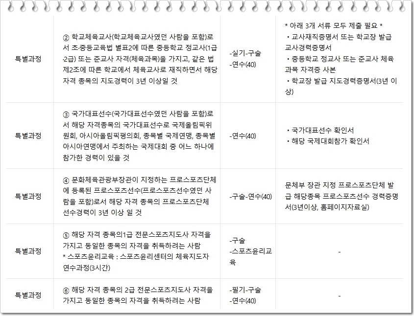 특별과정은 일반과정보다 응시 조건이 완화된 경로로, 학교 체육교사, 국가대표선수, 프로스포츠 선수 등의 특정 경력을 가진 지원자가 필기시험 면제 등의 혜택을 받을 수 있는 과정입니다. 특별과정은 총 5가지 세부 조건으로 나뉘며, 각각 요구되는 자격과 서류가 다릅니다.