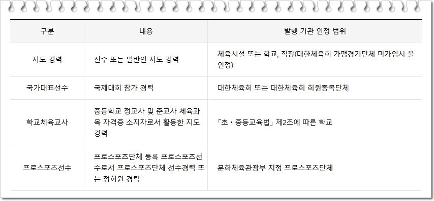 체육시설, 학교, 직장에서 해당 종목의 지도 경력이 있어야 하며, 3년 이상의 활동을 증명할 수 있어야 하고,  지도 경력은 종목별로 구체적인 활동 내역을 증빙해야 합니다.